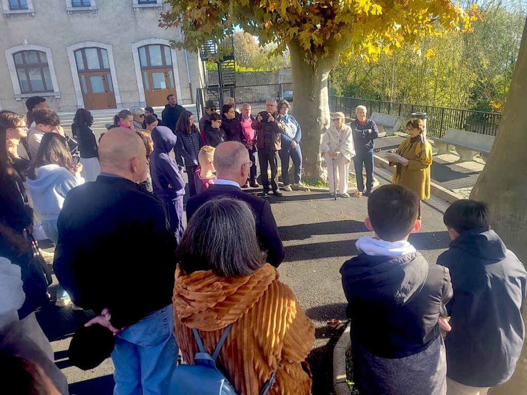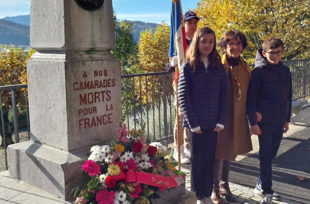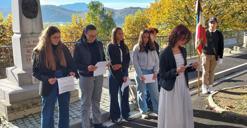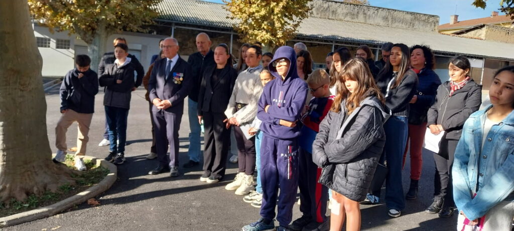 À l’occasion de la commémoration nationale du 11 novembre 2025, notre présidente avait décidé de reprendre la tradition. Dès 10 h, un groupe d’anciens élèves, accompagné d’une classe du collège avec porte-drapeau, se retrouva autour de la stèle, à la grande satisfaction de Madame Gaujarengues, principale du collège Leclerc.